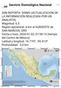 Oaxaca de Juárez, Oax. 2 de enero de 2026.- La Coordinación Estatal de Protección Civil y Gestión de Riesgos (CEPCyGR) informa que la entidad oaxaqueña reporta saldo blanco, sin afectaciones a la población, infraestructura, ni servicios básicos; luego de sismo de magnitud 6.5, registrado a las 7:58 horas, con epicentro al suroeste de San Marcos, Guerrero.