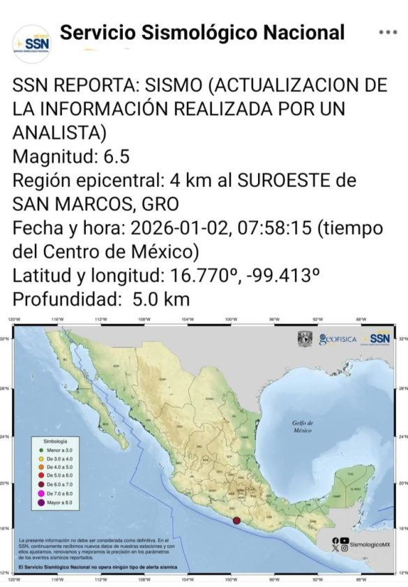 Oaxaca de Juárez, Oax. 2 de enero de 2026.- La Coordinación Estatal de Protección Civil y Gestión de Riesgos (CEPCyGR) informa que la entidad oaxaqueña reporta saldo blanco, sin afectaciones a la población, infraestructura, ni servicios básicos; luego de sismo de magnitud 6.5, registrado a las 7:58 horas, con epicentro al suroeste de San Marcos, Guerrero.