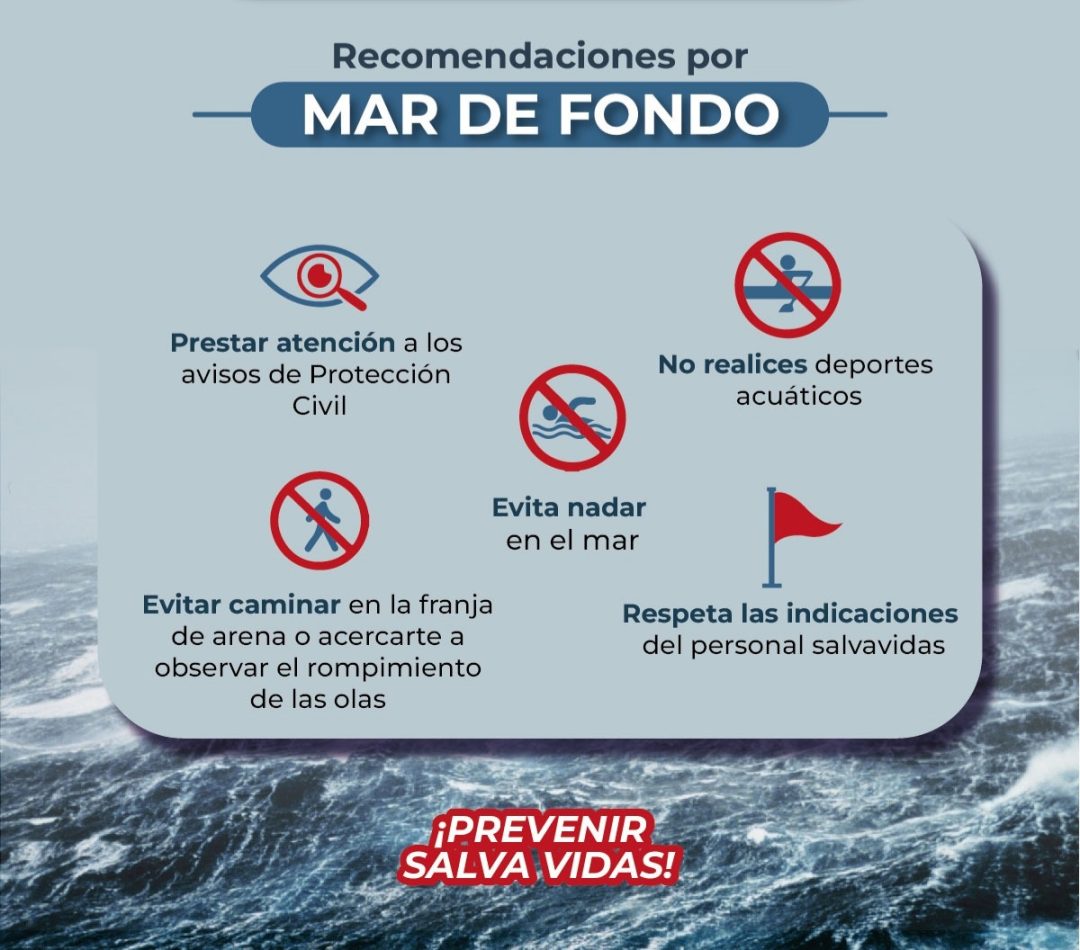 Se exhorta a la población atender en todo momento las indicaciones de las Capitanías de Puerto, Protección Civil, guardavidas, Secretaría de Marina y la Guardia Nacional; así como mantenerse informada a través de medios y redes sociales oficiales: Facebook @CEPCyGRGobOax y en X @CEPCyGR_GobOax.