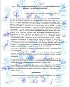 Asunción Nochixtlán, Oaxaca a 07 de noviembre del 2025. En días anteriores ha circulado una convocatoria por parte de la representación