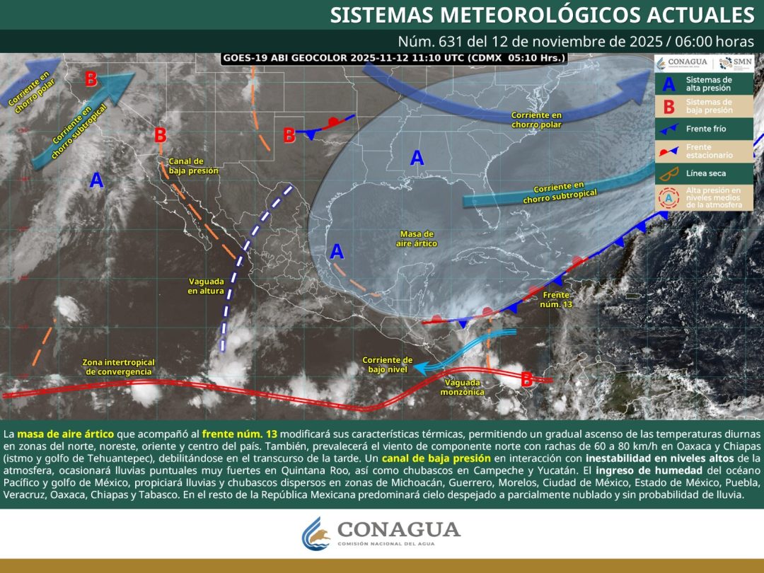 De acuerdo con el pronóstico del tiempo emitido por la Comisión Nacional del Agua (Conagua), esto se debe a que la masa de aire que impulsa al frente frío número 13, entrará en proceso de modificación.