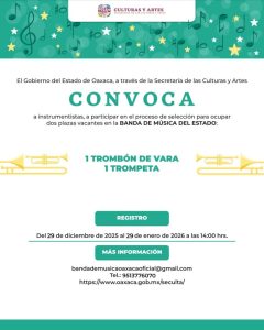 Oaxaca de Juárez, Oax. 30 de diciembre de 2025.- El Gobierno de Oaxaca convoca a las y los instrumentistas oaxaqueños a participar en el proceso de selección para ocupar dos plazas vacantes de trompeta y trombón de vara en la Banda de Música del Estado, bajo contrato de confianza.