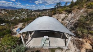 El proyecto se desarrolló en un área de 666.54 metros cuadrados, donde se colocaron columnas de concreto, estructura de acero y cubierta, que incluye sistema de drenaje pluvial.