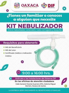 Oaxaca de Juárez, Oax. 21 de febrero de 2026.- Con el propósito de respaldar la salud de las familias, el Sistema para el Desarrollo Integral de la Familia (DIF) Oaxaca brindará de forma gratuita a personas que por alguna condición medica lo requieran, 3 mil kits nebulizadores, los cuales contienen micro nebulizador, extensión, tubo corrugado y boquilla.