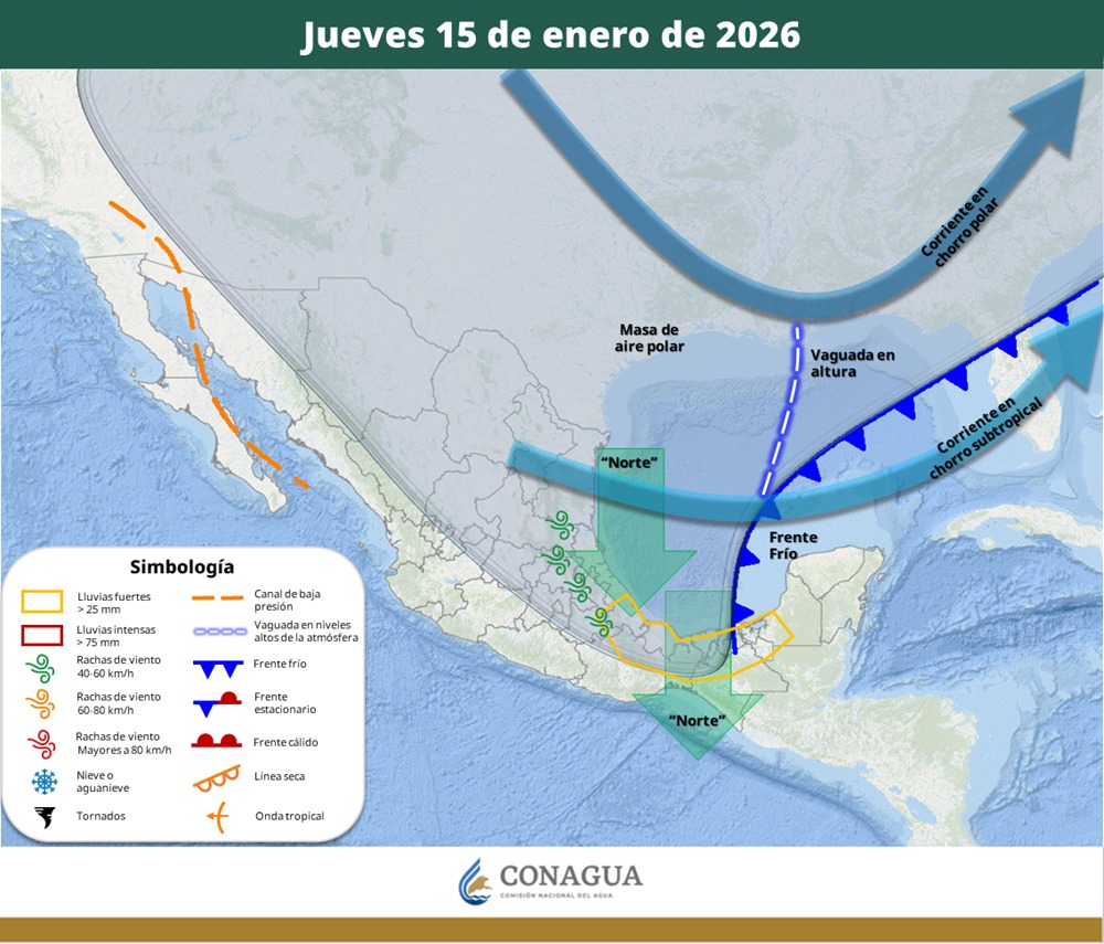 Mientras que el domingo, continuarán las condiciones con heladas al amanecer y chubascos aislados en la porción más al norte del estado. Asimismo, se espera un evento de norte intenso, con rachas de 80 a 100 kilómetros por hora en el oriente del Istmo de Tehuantepec, principalmente en el tramo carretero La Venta–La Ventosa.