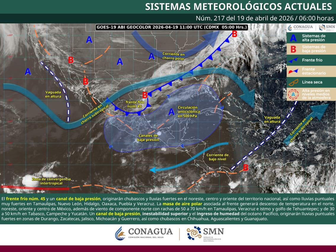 Oaxaca de Juárez, Oax. 19 de abril de 2026.- La Coordinación Estatal de Protección Civil y Gestión de Riesgos (CEPCyGR) informa que el frente frío número 45 se desplazará este día hacia el Golfo de México e interactuará con un canal de baja presión sobre el sureste del país, lo que ocasionará la formación de nubes de tormenta en el norte del Istmo, Sierra Sur, Mixteca y algunos sectores de la Costa.