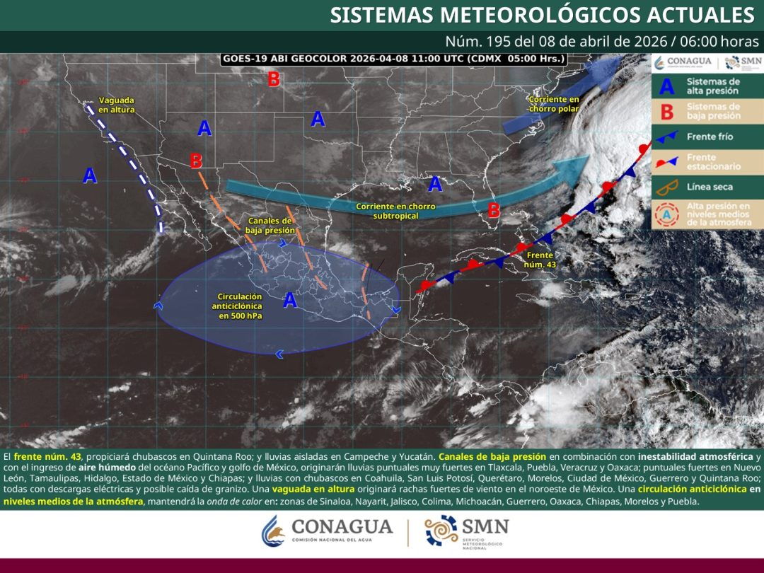 De acuerdo con el pronóstico del tiempo emitido por la Comisión Nacional del Agua (Conagua), estas condiciones son ocasionadas por la presencia de una circulación anticiclónica ubicada en niveles medios de la atmósfera, en interacción con un canal de baja presión.