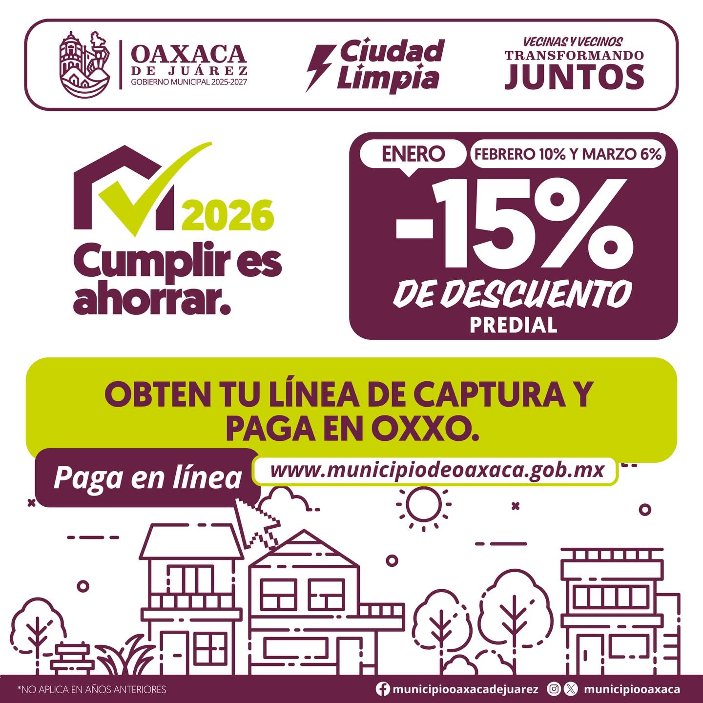 Oaxaca de Juárez, Oax., 2 de enero de 2026. El Municipio de Oaxaca de Juárez informa a las vecinas y vecinos que ya inició el periodo de pago del impuesto predial correspondiente al ejercicio fiscal 2026, como parte del programa «Cumplir es Ahorrar», el cual contempla un 15 por ciento de descuento durante el mes de enero.