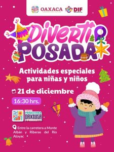 Oaxaca de Juárez, Oax. 16 de diciembre de 2025.- Con motivo de las fiestas decembrinas, el Sistema para el Desarrollo Integral de la Familia (DIF) Oaxaca invita a niñas, niños y familias a participar en la Diverti Posada, que se llevará a cabo el domingo 21 de diciembre a partir de las 16:30 horas.