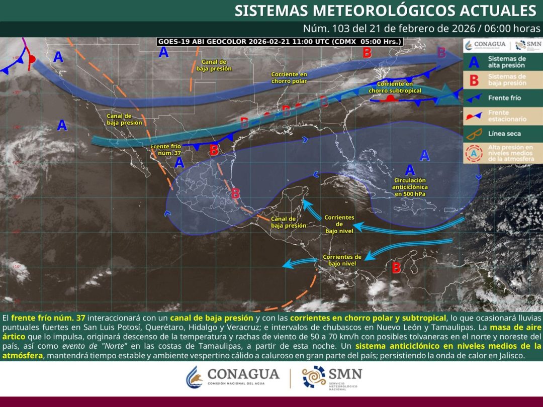 Por otra parte, el frente frío número 37 se extiende sobre el noreste del país y se mantiene en vigilancia, ya que podría aproximarse al sureste de México durante el fin de semana.