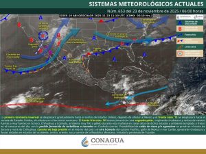 Además, se prevén vientos del norte y noroeste de intensidad moderada en la porción oriental del Istmo de Tehuantepec, con algunas rachas ligeramente elevadas.
