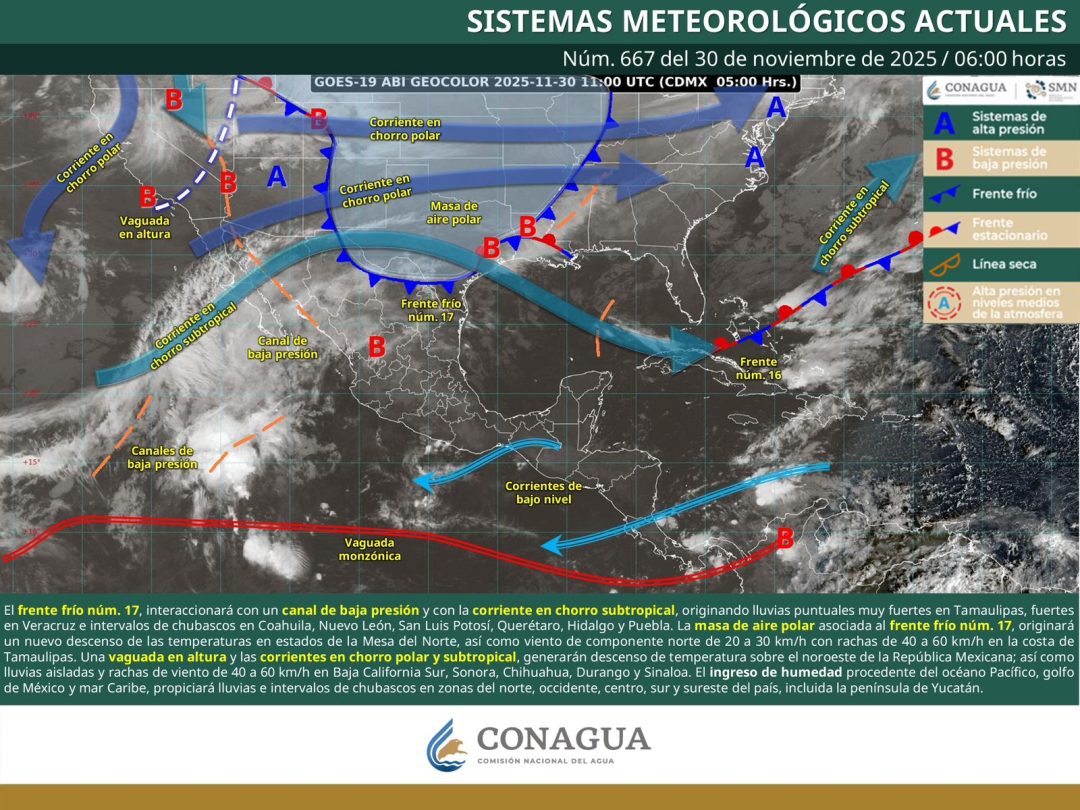 De acuerdo con el pronóstico del tiempo emitido por la Comisión Nacional del Agua (Conagua), la masa de aire frío que impulsó al frente frío número 16, ha entrado en proceso de modificación térmica y se ha transformado en una circulación anticiclónica en niveles medios de la atmósfera.
