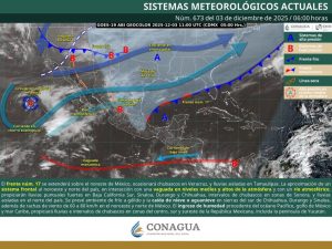 Por otro lado, un nuevo frente frío se aproximará este miércoles al noroeste y norte de la República Mexicana, por lo que se mantiene en monitoreo permanente para evaluar sus posibles efectos en los próximos días.