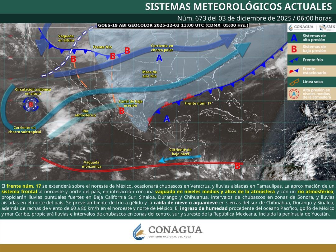 De acuerdo con el pronóstico del tiempo emitido por la Comisión Nacional del Agua (Conagua), esto se debe a que el frente frío número 17 permanece casi estacionario sobre el noreste de México, bloqueado por un fuerte anticiclón ubicado en niveles medios y altos de la atmósfera.
