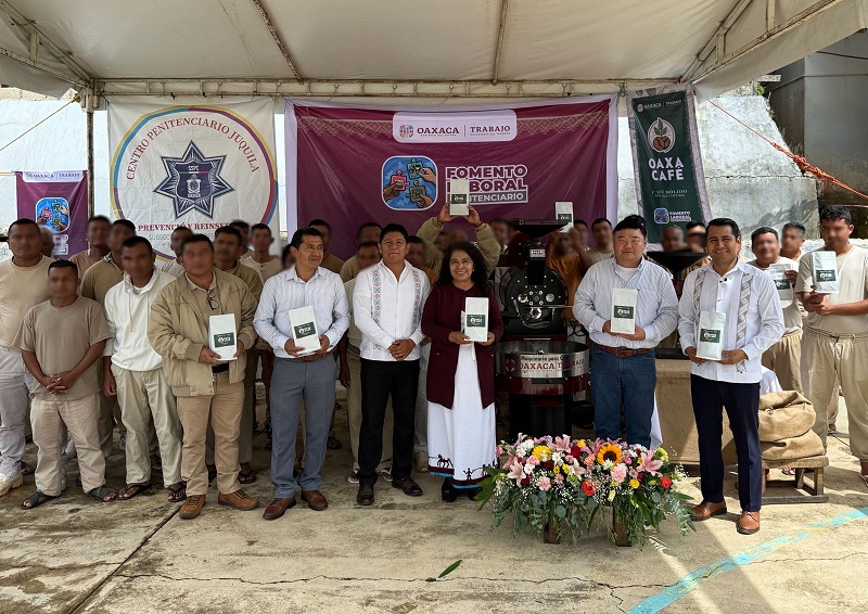 Oaxaca de Juárez, Oax. 9 de octubre de 2025.- En un hecho sin precedentes, el Gobierno del Estado presentó el primer Modelo Productivo Penitenciario de México “OaxaCAFÉ”, con lo que inicia su elaboración y comercialización por parte Personas Privadas de su Libertad (PPL) del Centro Penitenciario de Santa Catarina Juquila.