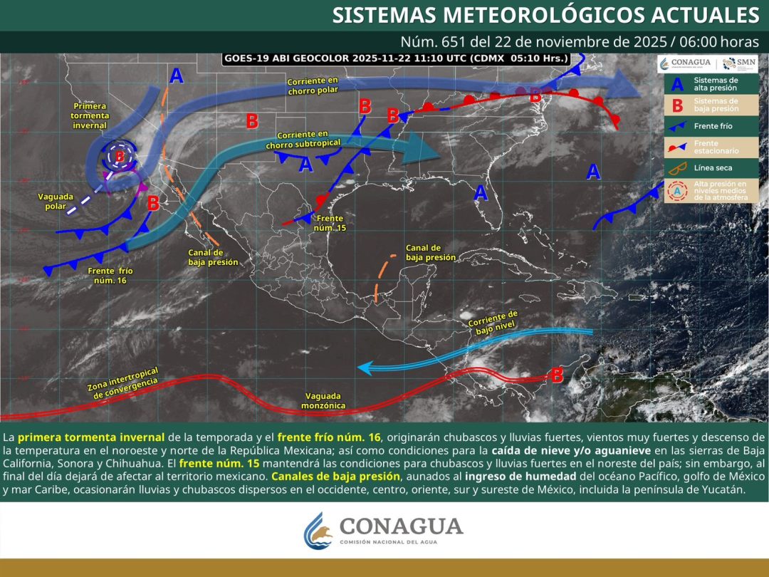 Por otra parte, se espera que la tormenta invernal número uno de la temporada, ingrese este día al noroeste de México, especialmente en Baja California y Sonora. Por delante de este sistema avanza el frente frío número 16, el cual podría llegar a mediados de la semana, generando condiciones invernales como descenso de temperatura, evento de norte, algunas lluvias y posibles heladas.