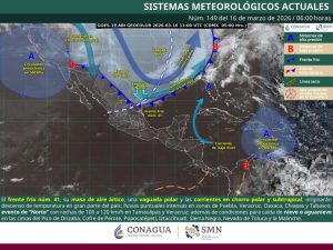 Asimismo, el cambio en la presión atmosférica favorecerá el desarrollo de un evento de “Norte” muy fuerte a intenso, con rachas de viento de 100 a 120 kilómetros por hora en el oriente del Istmo, además de oleaje elevado en aguas del Golfo de Tehuantepec, que podría alcanzar hasta los 4 metros de altura.