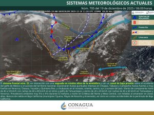 En tanto, los vientos del norte presentarán un ligero incremento, generando tiempo ventoso con rachas ocasionalmente fuertes en el oriente del Istmo de Tehuantepec, así como brisa marina a lo largo de la línea de costa.
