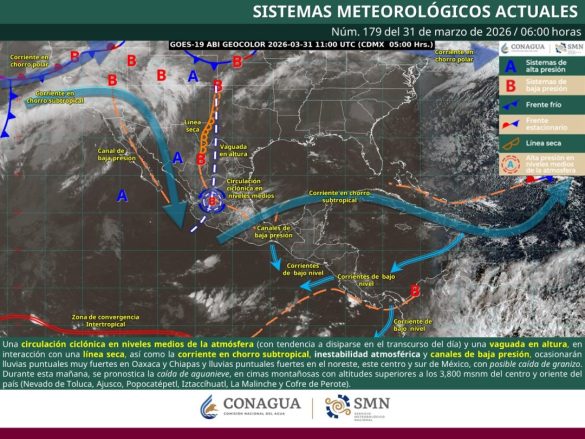 Oaxaca de Juárez, Oax., 31 de marzo de 2026.- La Coordinación Estatal de Protección Civil y Gestión de Riesgos (CEPCyGR) informa que una vaguada en niveles altos de la atmósfera y un canal de baja presión sobre el interior del país ocasionarán un incremento de la nubosidad, así como lluvias y tormentas eléctricas, con mayor inestabilidad durante las horas vespertinas y nocturnas.