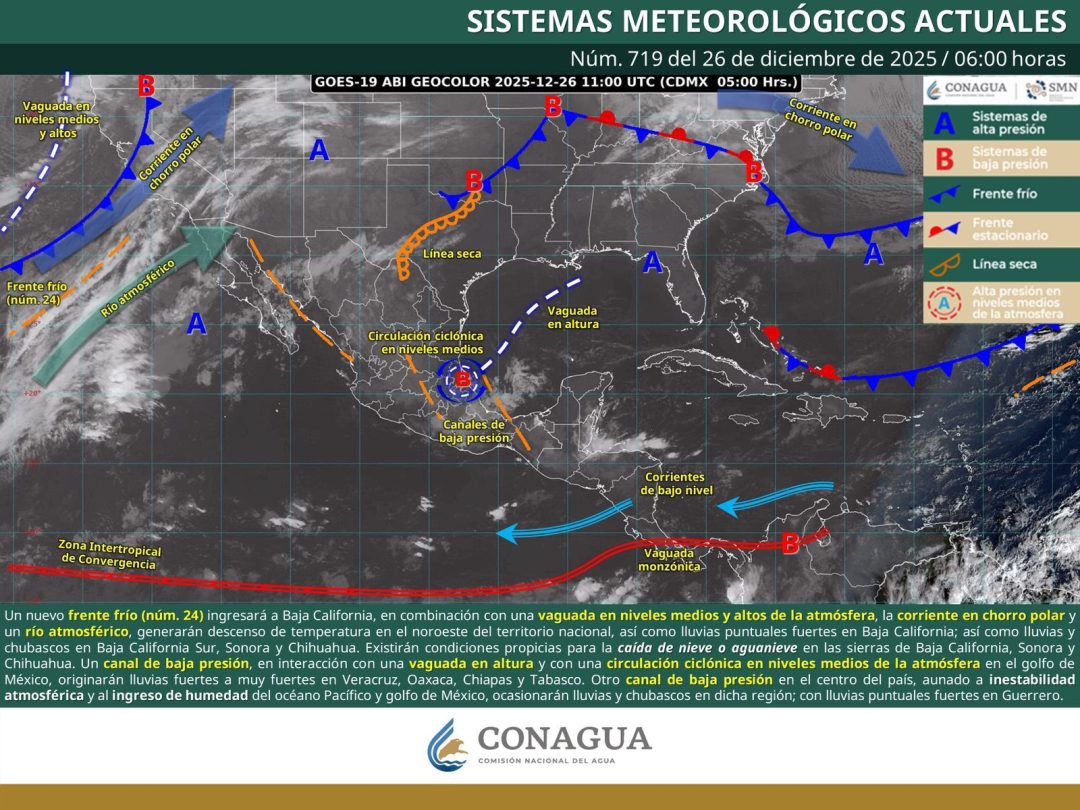 Asimismo, se mantiene probabilidad de lluvias y lloviznas en diversos puntos, con precipitaciones localmente fuertes en la porción norte del estado y en algunos sectores de la Sierra Sur.