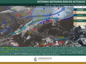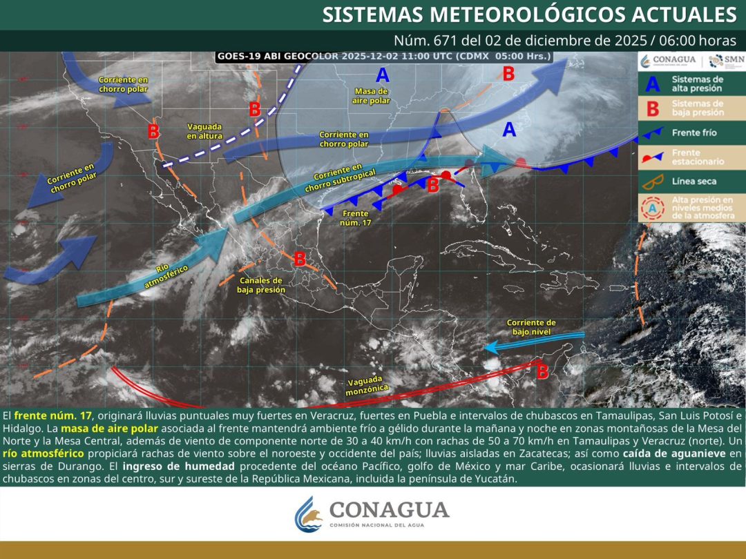 De acuerdo con el pronóstico del tiempo emitido por la Comisión Nacional del Agua (Conagua), un anticiclón bien estructurado en niveles medios y altos de la atmósfera, cuyo centro se ubica al oriente de la Península de Yucatán, mantiene una amplia influencia sobre ese territorio y el Caribe, además del sureste, centro y sur de México. Este sistema impide el avance del frente frío número 17 hacia Oaxaca.