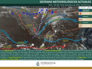 En el oriente del Istmo de Tehuantepec el viento se mantendrá del norte, con intensificación durante la tarde y velocidades promedio de 40 a 60 kilómetros por hora; así como oleaje ligeramente elevado en aguas costeras del Golfo de Tehuantepec.