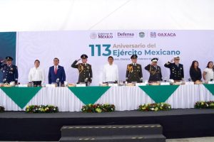 En este marco solemne realizado en la 28 Zona Militar, el Mandatario oaxaqueño resaltó el trabajo permanente de esta institución al servicio de la patria, con un despliegue en el país de más de 150 mil mujeres y hombres, que en conjunto defienden la soberanía de la nación.