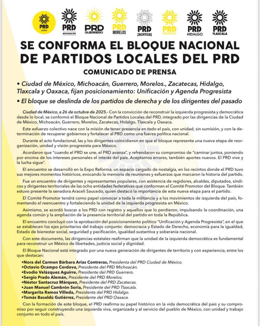 Con la formación de este bloque, el PRD reafirma su papel histórico en la vida democrática del país y su compro-miso por seguir construyendo una izquierda viva, organizada y al servicio del pueblo de México, con unidad y trabajo conjunto en todo el país.
