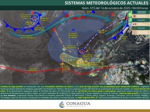 Asimismo, continúa en monitoreo la zona de baja presión al sur de las costas de Chiapas y Oaxaca.