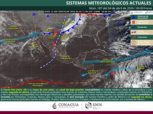 Oaxaca de Juárez, Oax., 4 de abril de 2026.– La Coordinación Estatal de Protección Civil y Gestión de Riesgos (CEPCyGR) informa que se prevén lluvias con intervalos de chubascos, actividad eléctrica aislada y rachas fuertes de viento.
