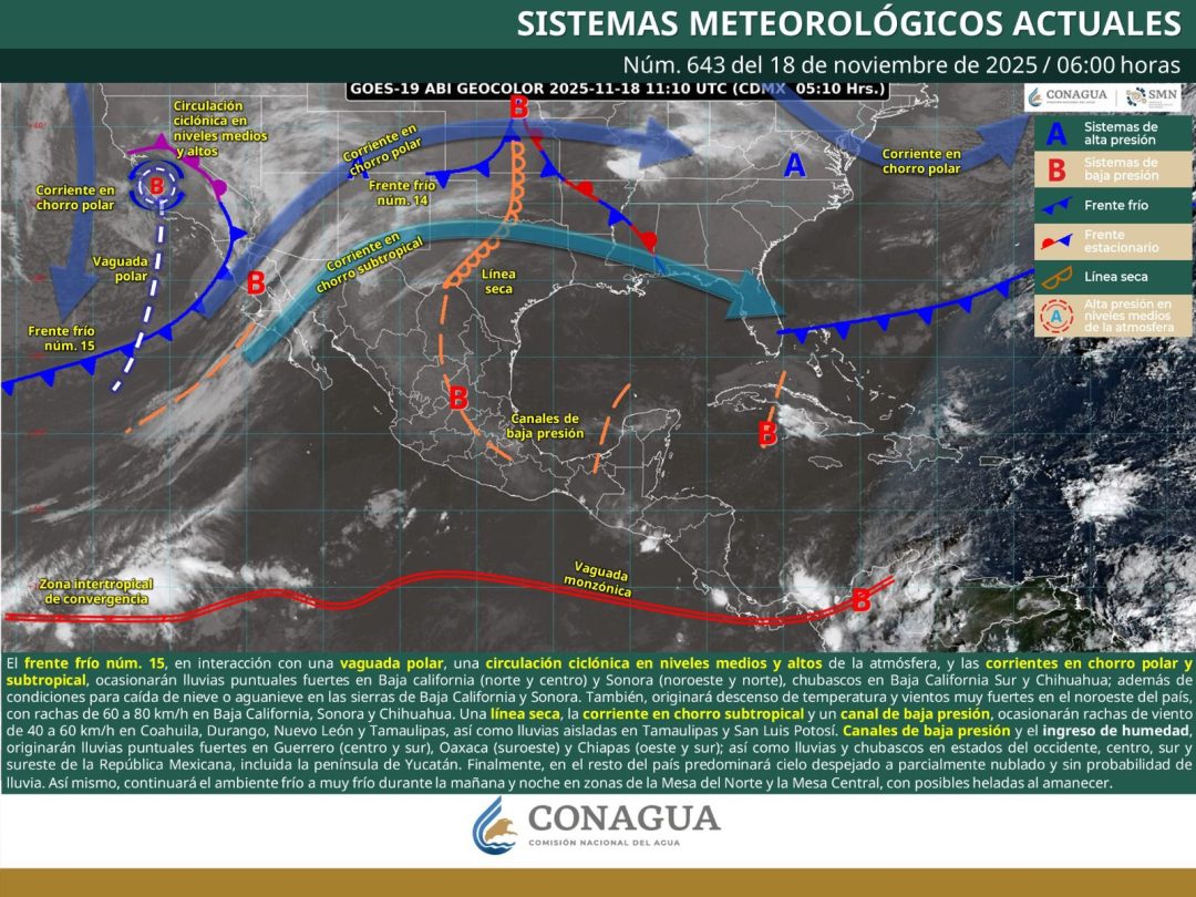 Por otro lado, el frente frío número 15 se aproxima al oeste de la República Mexicana y se mantiene en vigilancia.