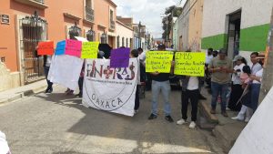 Trabajadores del IMSS Bienestar adheridos a la Fuerza Independiente de Trabajadores de la Salud, bloquearon la intersección de las calles de Moctezuma y 20 de Noviembre de la capital oaxaqueña, para exigir el pago retroactivo 2025, la prima dominical que se les adeuda desde 2023 y la entrega de uniformes.