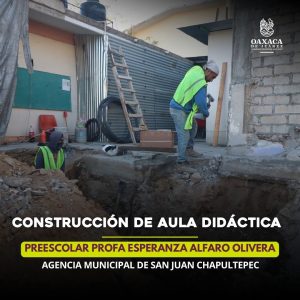 En San Juan Chapultepec se realiza la construcción de un aula didáctica en el Preescolar Esperanza Alfaro Olivera, brindando un entorno digno y seguro para el desarrollo de niñas y niños desde la primera infancia.