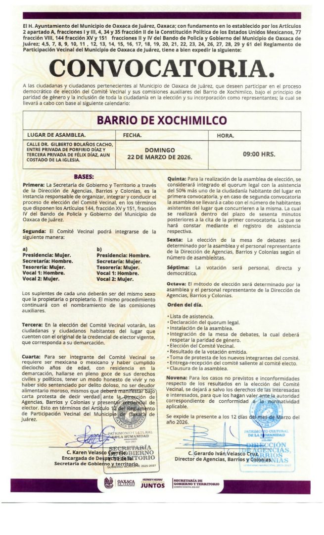 Con el propósito de fortalecer la organización comunitaria y promover la participación activa de la ciudadanía, la Secretaría de Gobierno y Territorio del Municipio de Oaxaca de Juárez, a través de la Dirección de Barrios y Colonias, emitió nuevas convocatorias para la renovación de Comités Vecinales y sus Comisiones Auxiliares en dos zonas más de la capital.