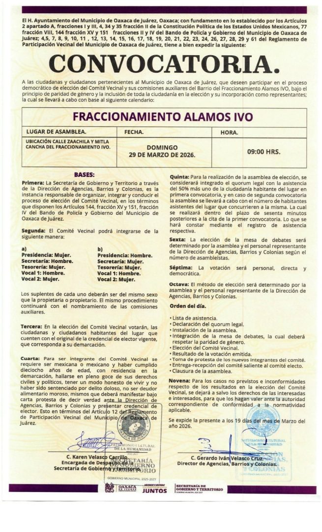 Como parte de las acciones para fortalecer el tejido social y promover una ciudadanía más participativa, la Secretaría de Gobierno y Territorio del Municipio de Oaxaca de Juárez, a través de la Dirección de Barrios y Colonias, puso en marcha una nueva etapa de renovación de Comités Vecinales y Comisiones Auxiliares en el Fraccionamiento Álamos Infonavit y el Fraccionamiento Álamos IVO.