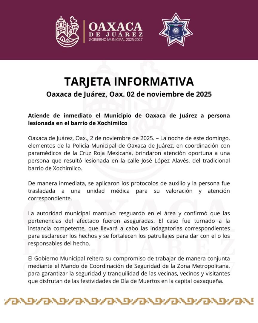 Oaxaca de Juárez, Oax., 2 de noviembre de 2025. – La noche de este domingo, elementos de la Policía Municipal de Oaxaca de Juárez, en coordinación con paramédicos de la Cruz Roja Mexicana, brindaron atención oportuna a una persona que resultó lesionada en la calle José López Alavés, del tradicional barrio de Xochimilco.