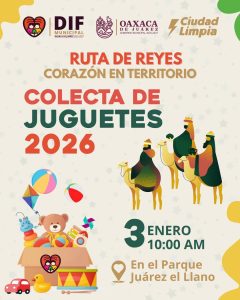Oaxaca de Juárez, Oax., 2 de enero de 2026.- Con el objetivo de llevar sonrisas, alegría y esperanza a niñas y niños de las agencias municipales, el Sistema DIF Municipal de Oaxaca de Juárez invita a la ciudadanía a participar en la Colecta de Juguetes 2026 “Ruta de Reyes, Corazón en Territorio”, que se realizará mañana sábado 3 de enero, a partir de las 10:00 de la mañana, en el Parque Juárez El Llano.