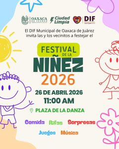 Oaxaca de Juárez, Oax., 21 de abril de 2026.— Con el objetivo de fomentar la convivencia familiar y celebrar la alegría de la infancia, el Sistema DIF Municipal de Oaxaca de Juárez, encabezado por su presidenta honoraria Gaby García Fernández del Campo, invita a las familias capitalinas a participar en el Festival de la Niñez 2026.