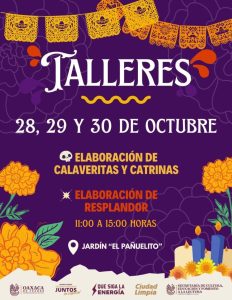 Como antesala a la gran celebración de los Fieles Difuntos, se llevarán a cabo talleres de elaboración de calaveritas, catrinas y resplandores, de 11:00 a 15:00 horas, del 28 al 30 de octubre, donde niñas, niños y familias podrán crear sus propios símbolos de esta festividad ancestral.