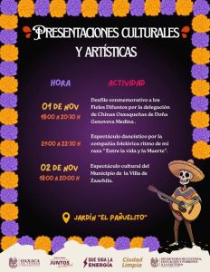 El 1 y 2 de noviembre, el escenario del Pañuelito se llenará de tradición con el desfile conmemorativo de las Chinas Oaxaqueñas de Genoveva Medina, la compañía folclórica “Ritmo de mi raza” y la participación especial del Municipio de la Villa de Zaachila.