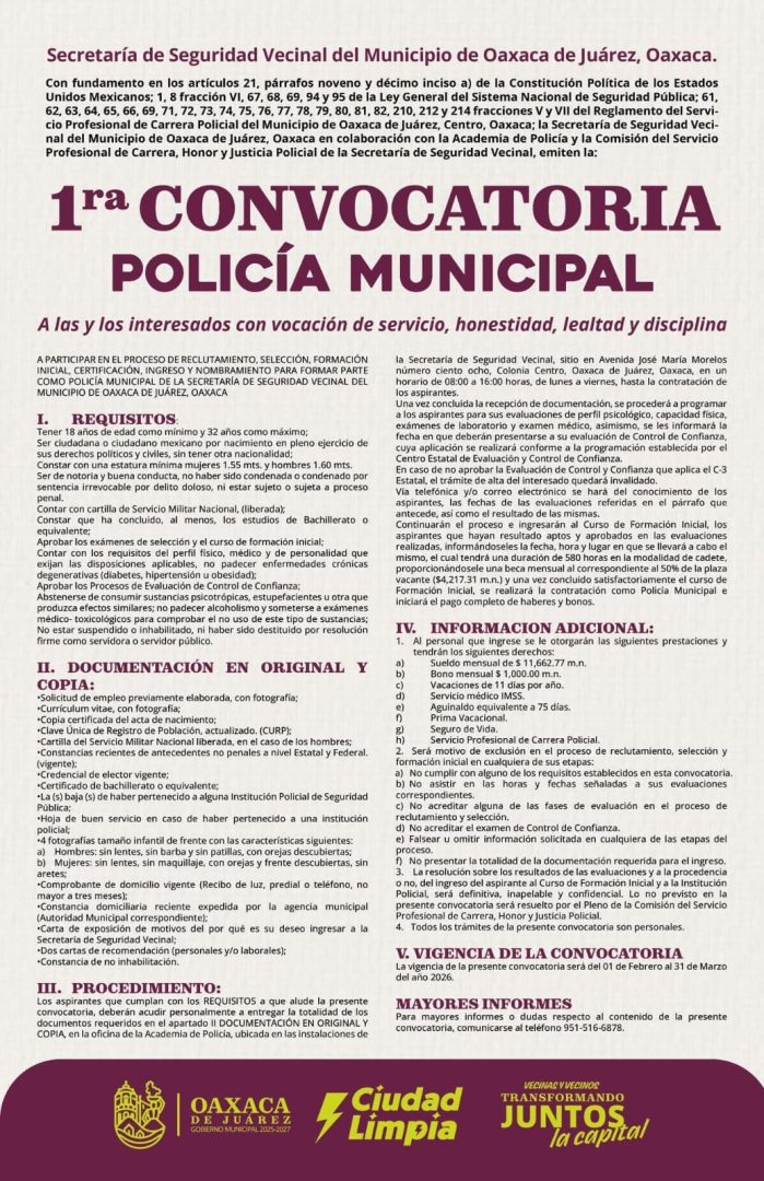 Oaxaca de Juárez, Oax. 12 de febrero de 2026.- Con el objetivo de fortalecer una corporación cercana a la ciudadanía y consolidar una ciudad más segura, el Ayuntamiento de Oaxaca de Juárez, a través de la Secretaría de Seguridad Vecinal, emitió la Primera Convocatoria para ingresar a la Policía Municipal.