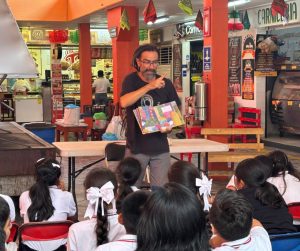 La actividad estuvo a cargo del narrador Josémi García, quien cautivó a niñas, niños, comerciantes y familias con la historia Sandía Sin Humos, un relato lleno de imaginación, humor y mensajes positivos que invitó a reflexionar sobre la importancia de la lectura en la vida cotidiana.