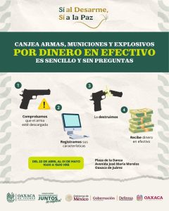 Oaxaca de Juárez, Oax., 20 de abril de 2026. — Con el objetivo de prevenir riesgos y fortalecer la tranquilidad en las comunidades, autoridades de los tres órdenes de gobierno anunciaron la jornada “Sí al Desarme, Sí a la Paz”, que se llevará a cabo del 22 de abril al 1 de mayo en la Plaza de la Danza.
