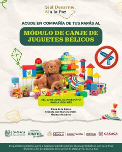 Como parte de esta estrategia, también se instalará un módulo de canje de juguetes bélicos, dirigido a niñas y niños, con el propósito de fomentar desde temprana edad una cultura de paz y convivencia.