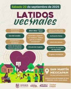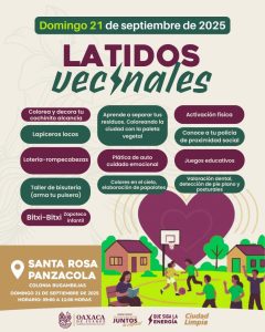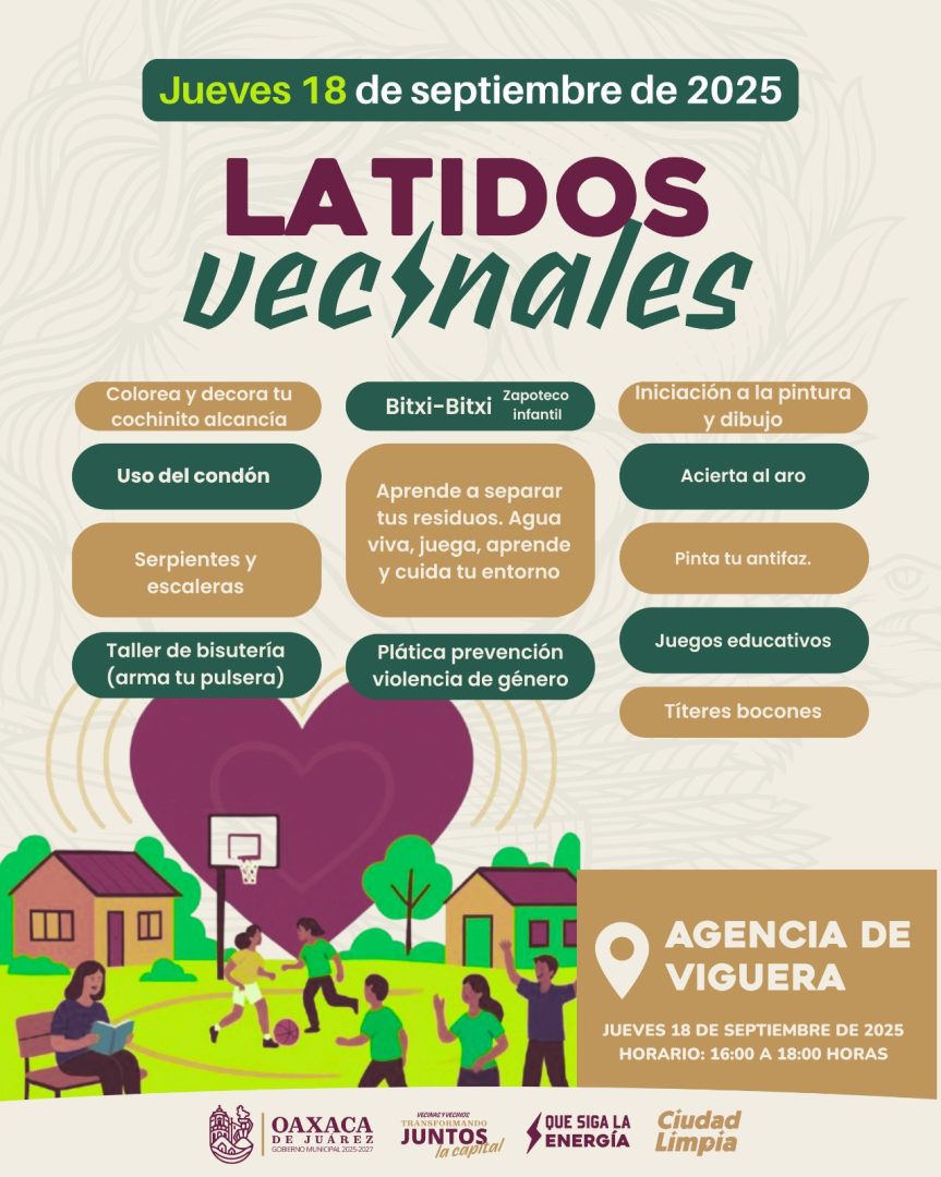 Oaxaca de Juárez, Oax., 18 de septiembre de 2025.- Con la convicción de seguir construyendo una capital cercana, participativa y con espacios seguros, el Municipio de Oaxaca de Juárez invita a las y los habitantes a sumarse a las jornadas de Latidos Vecinales, que se realizarán a partir de este jueves en distintas agencias de la ciudad.