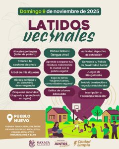 Oaxaca de Juárez, Oax., 6 de noviembre de 2025.- El Gobierno Municipal de Oaxaca de Juárez invita a las y los habitantes de la capital a participar en una nueva edición del programa Latidos Vecinales, una iniciativa que promueve la paz, la salud, la educación y el cuidado del entorno mediante actividades recreativas, talleres formativos y acciones de proximidad ciudadana.