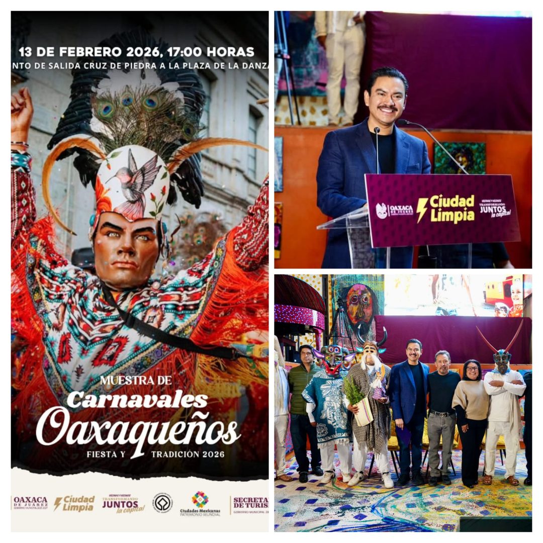 Oaxaca de Juárez, Oax., 3 de febrero de 2026.– En un entorno que refleja la riqueza cultural de la ciudad, el Ayuntamiento de Oaxaca de Juárez presentó los detalles de la Muestra de Carnavales Oaxaqueños 2026, una celebración que reunirá expresiones representativas de distintas regiones del estado y que se llevará a cabo el 13 de febrero, a partir de las 17:00 horas, con un recorrido que irá de la Cruz de Piedra a la Plaza de la Danza.