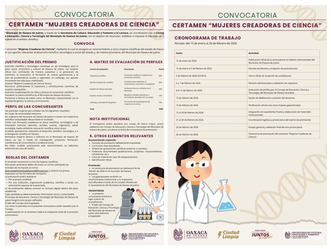 La convocatoria es impulsada a través de la Secretaría de Cultura, Educación y Fomento a la Lectura, en coordinación con el Consejo de Educación, Ciencia y Tecnología del Municipio de Oaxaca de Juárez, y está dirigida a mujeres mexicanas con trayectoria científica comprobable, prioritariamente originarias o con impacto directo en el municipio.