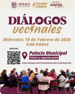 Oaxaca de Juárez, Oax., 16 de febrero de 2026.- El Municipio de Oaxaca de Juárez invita a vecinas y vecinos a participar en la próxima jornada de Diálogos Vecinales, un espacio de atención directa donde la ciudadanía puede presentar propuestas, planteamientos y prioridades para su colonia o agencia.