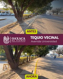 Oaxaca de Juárez, Oax., 15 de marzo de 2026.– Como parte de las acciones para recuperar y mejorar los espacios públicos de la capital, el Gobierno Municipal de Oaxaca de Juárez que preside Ray Chagoya llevó a cabo un Tequio Vecinal en Avenida Universidad, en la agencia de Candiani, donde se realizaron diversas labores de limpieza y mantenimiento urbano.